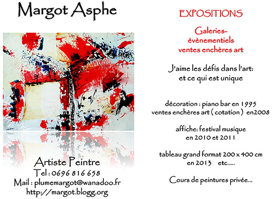 Asphe Margot | Artiste Peintre sur : Toile, Bois, Mur, Voile de Bateau, Papier Ancien, Fibre de Tronc de Bananiers... Expositions : Galerie, Évènementiel Ventes / Enchères / Arts / Décoration Maison Cours de Peintures Privés |