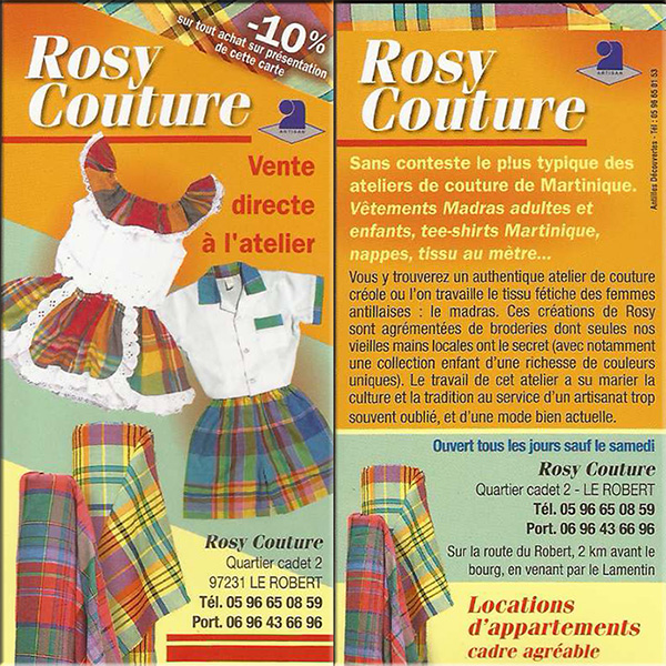 Rosy Couture | Vente Directe à l'Atelier Vêtements Madras Adultes & Enfants Tee-Shirts Martinique Nappes / Tissu au Mètre Location d'Appartements Atelier Couture |