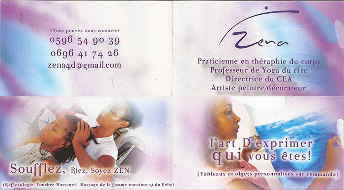 Zena | Centre de Formations et d'Éveils Artistiques Praticienne en Thérapie du Corps Professeur de Yoga du Rire Directrice du CEA Artiste Peintre / Décorateur L'Art d'Exprimer Qui Vous Êtes ! Tableaux et Objets Personnalisés sur Commande Soufflez, Riez, Soyez ZEN Réflexiologie / Massage Massage de la Femme Enceinte et du Bébé |